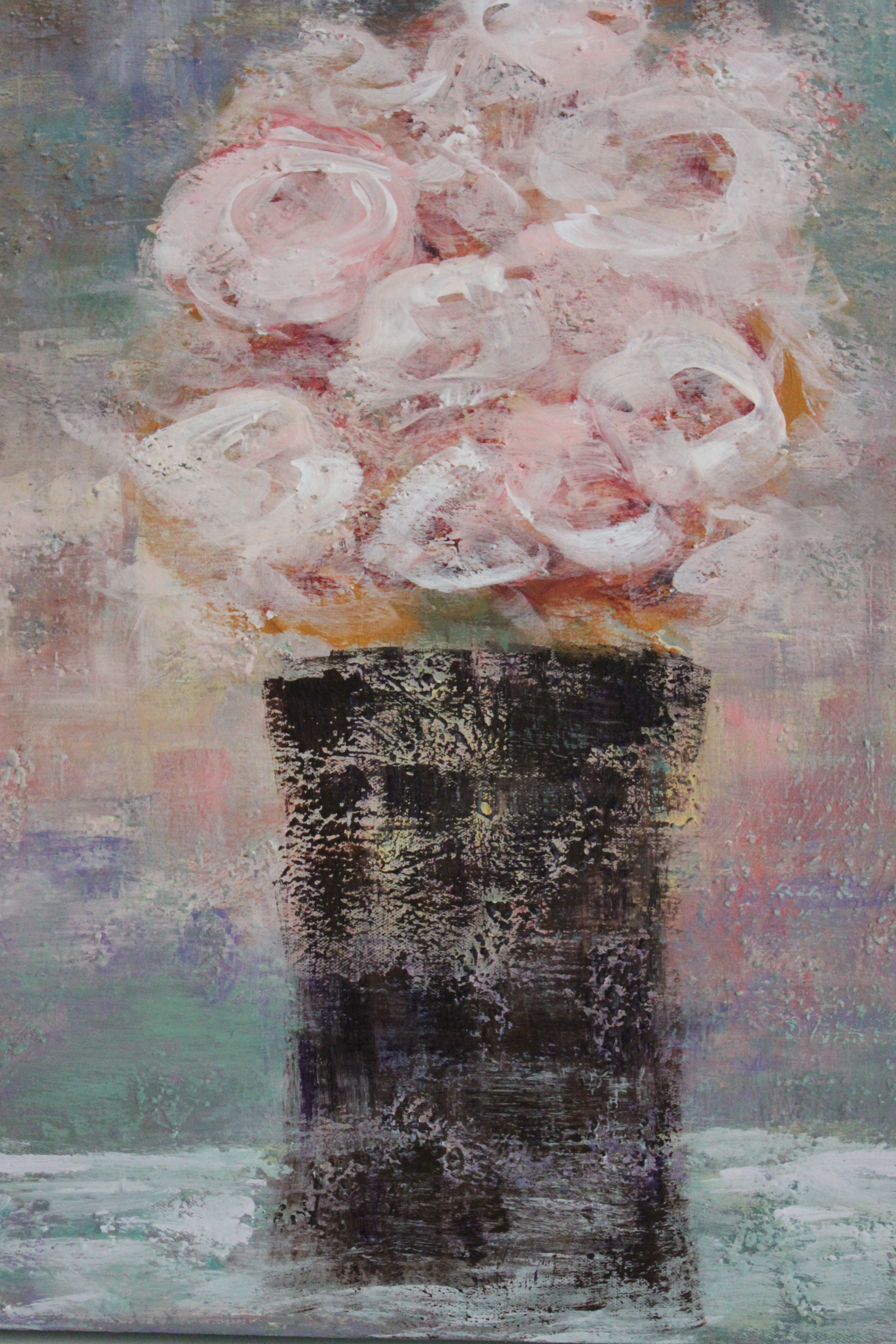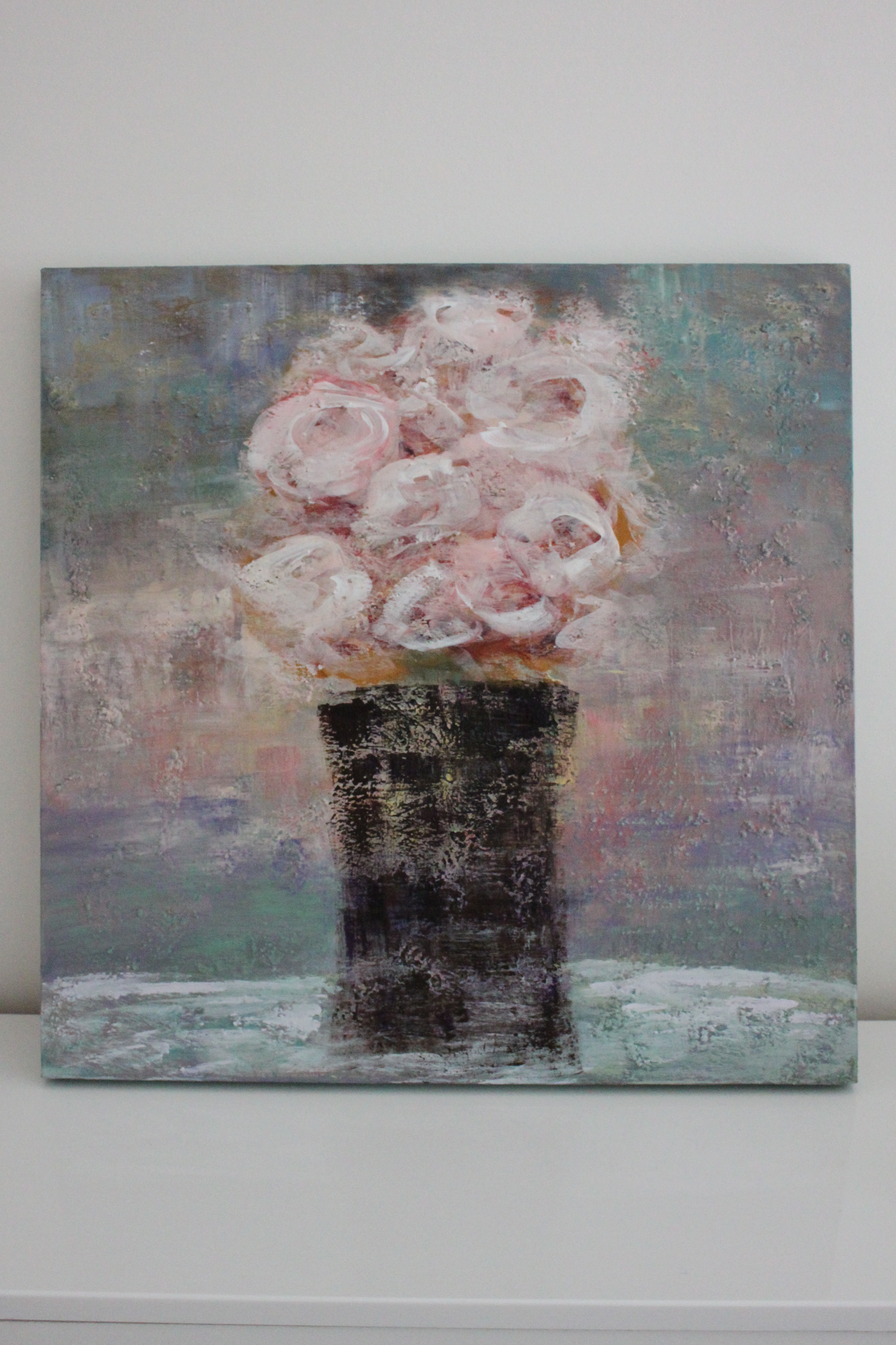 This is a very textured piece with a canvas that was primed with texture flakes throughout in order to catch the different layers of color. It’s a bit like a rainbow and isn’t that what a peaceful moment found feels like?